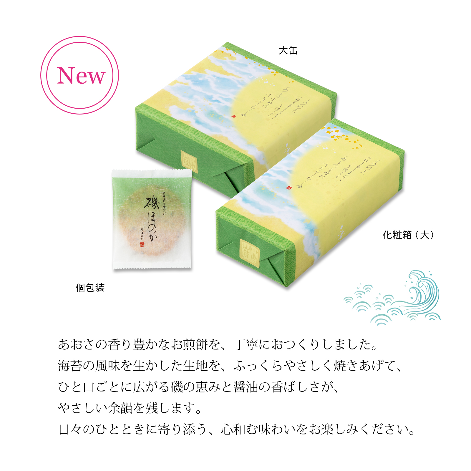 海苔の風味を生かした生地を、ふっくらやさしく焼きあげて、ひと口ごとに広がる磯の恵みと醤油の香ばしさが、やさしい余韻を残します。