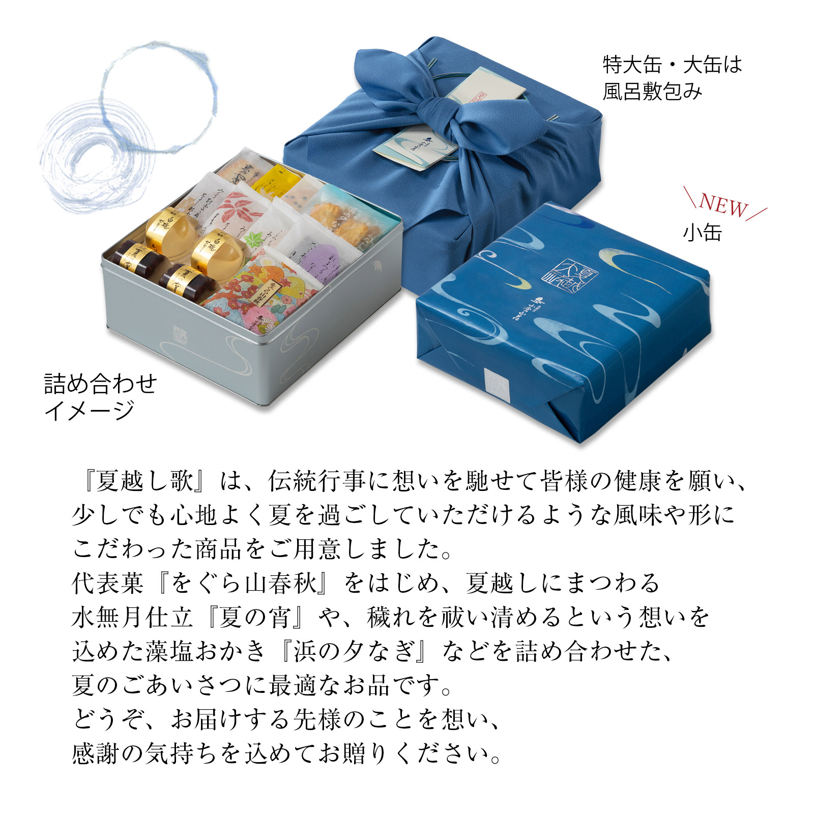 現代まで営々と続く身についた「穢れ」(けがれ)を祓う夏の伝統行事「夏越の祓」(なごしのはらえ)。 旺盛な生命力と除災の力を有する茅(ちがや)を編んでつくられた「茅の輪」(ちのわ)をくぐり、無病息災を祈ります。 「夏越の祓」には、古人の夏を乗り切れたことへの感謝の想いと、残り半年を無事に過ごせるようにといった願いが込められています。 『小倉百人一首』第九十八番・従二位家隆の和歌は、「夏越の祓」を詠ったもの。 『夏越し歌』は皆様のこれからの半年間の健康を願っておつくりした夏限定の詰め合わせです。 大切な方に感謝の心を届け先様を想う心を伝える夏のごあいさつにお使いください。