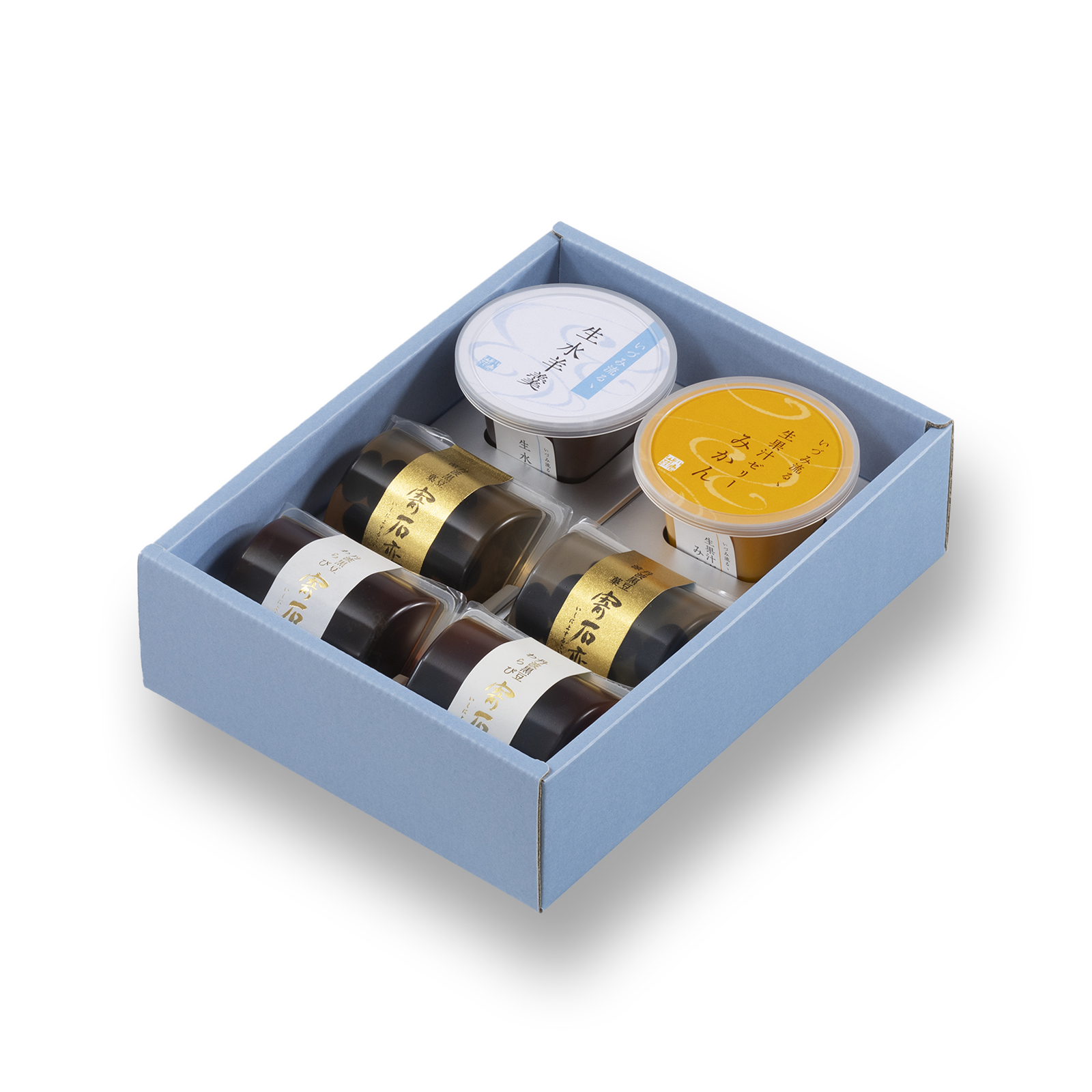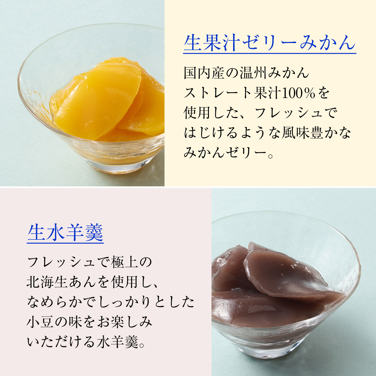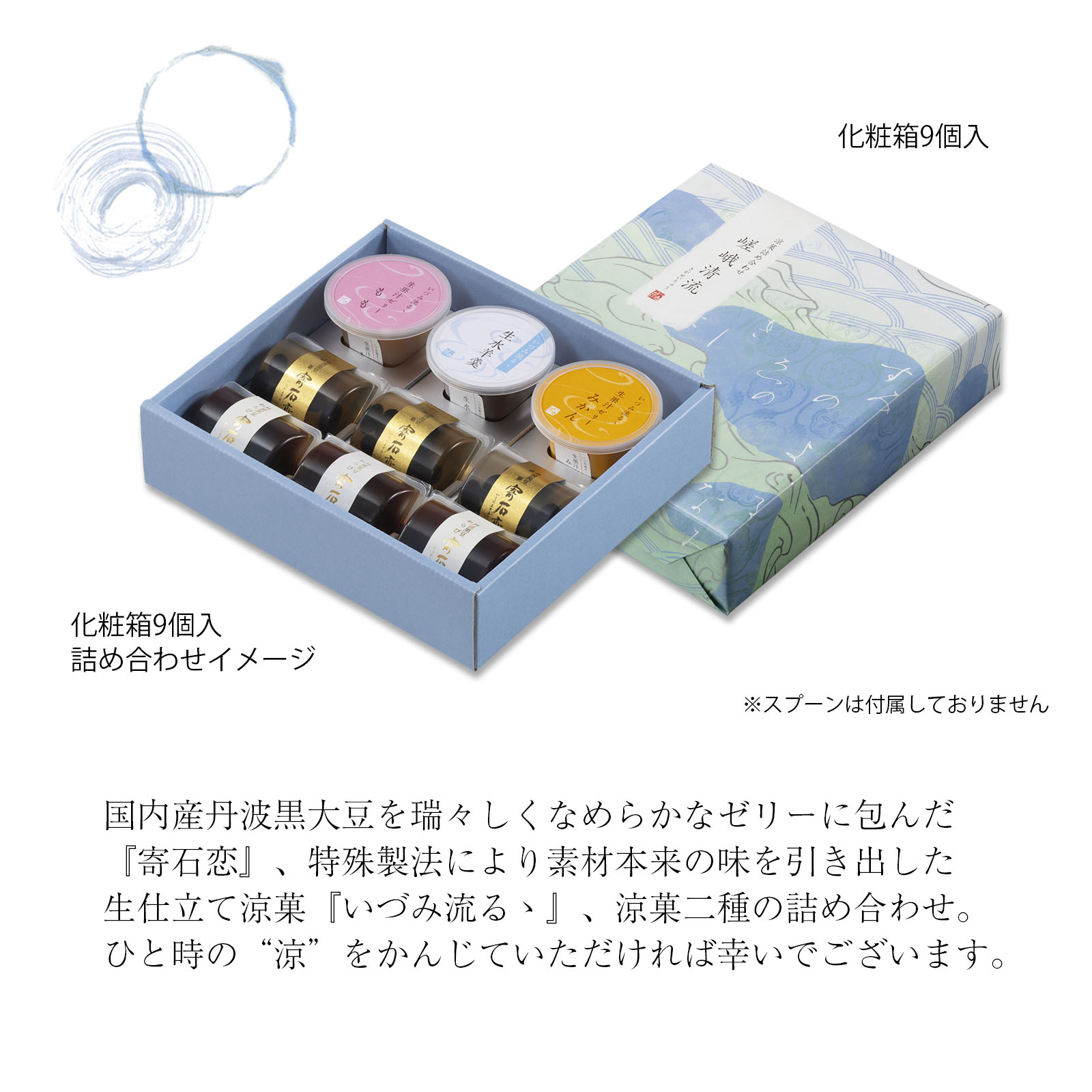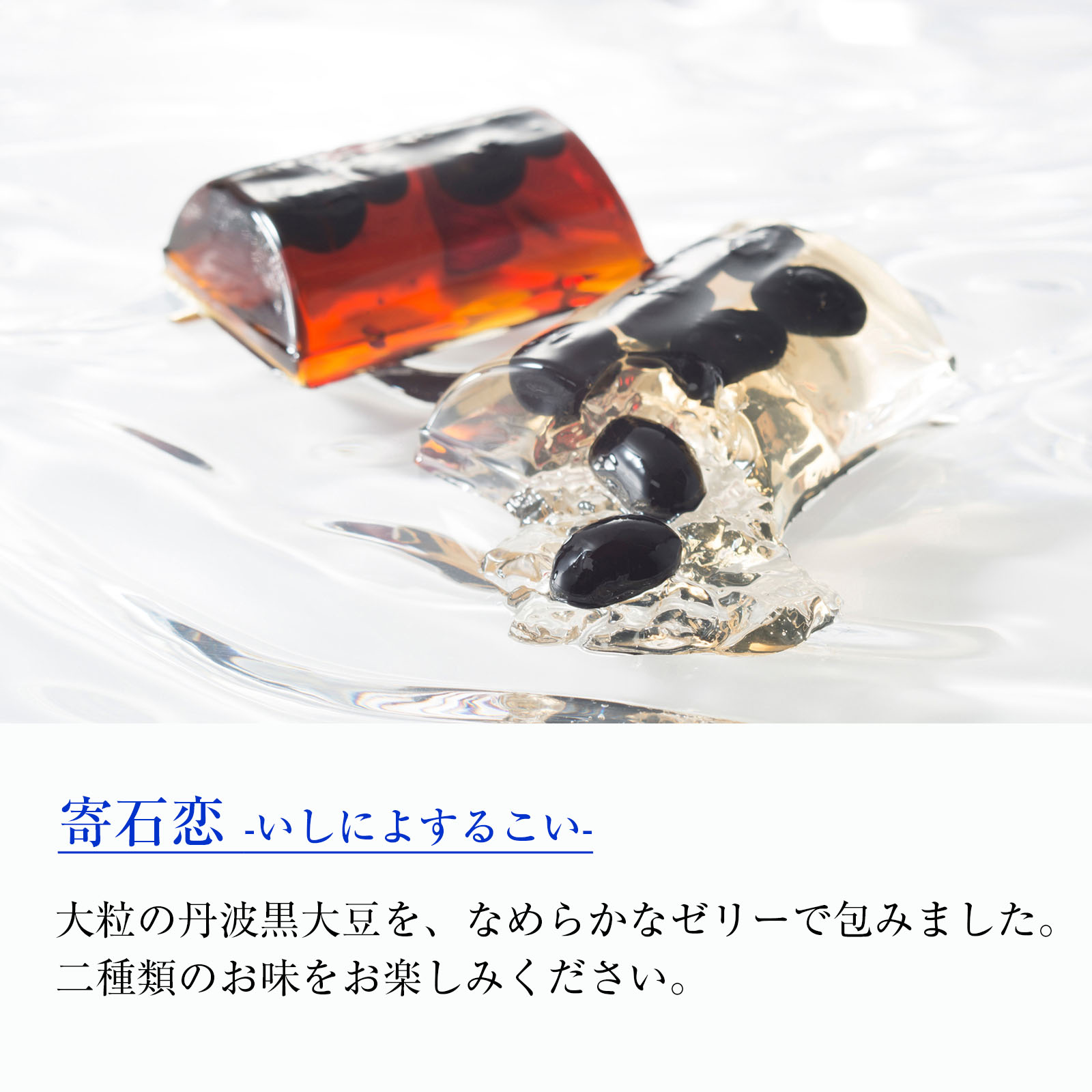 国内産丹波黒大豆を瑞々しくなめらかなゼリーに包んだ『寄石恋』、特殊製法により素材本来の味を引き出した生仕立て涼菓『いづみ流るゝ』、涼菓二種の詰め合わせ。