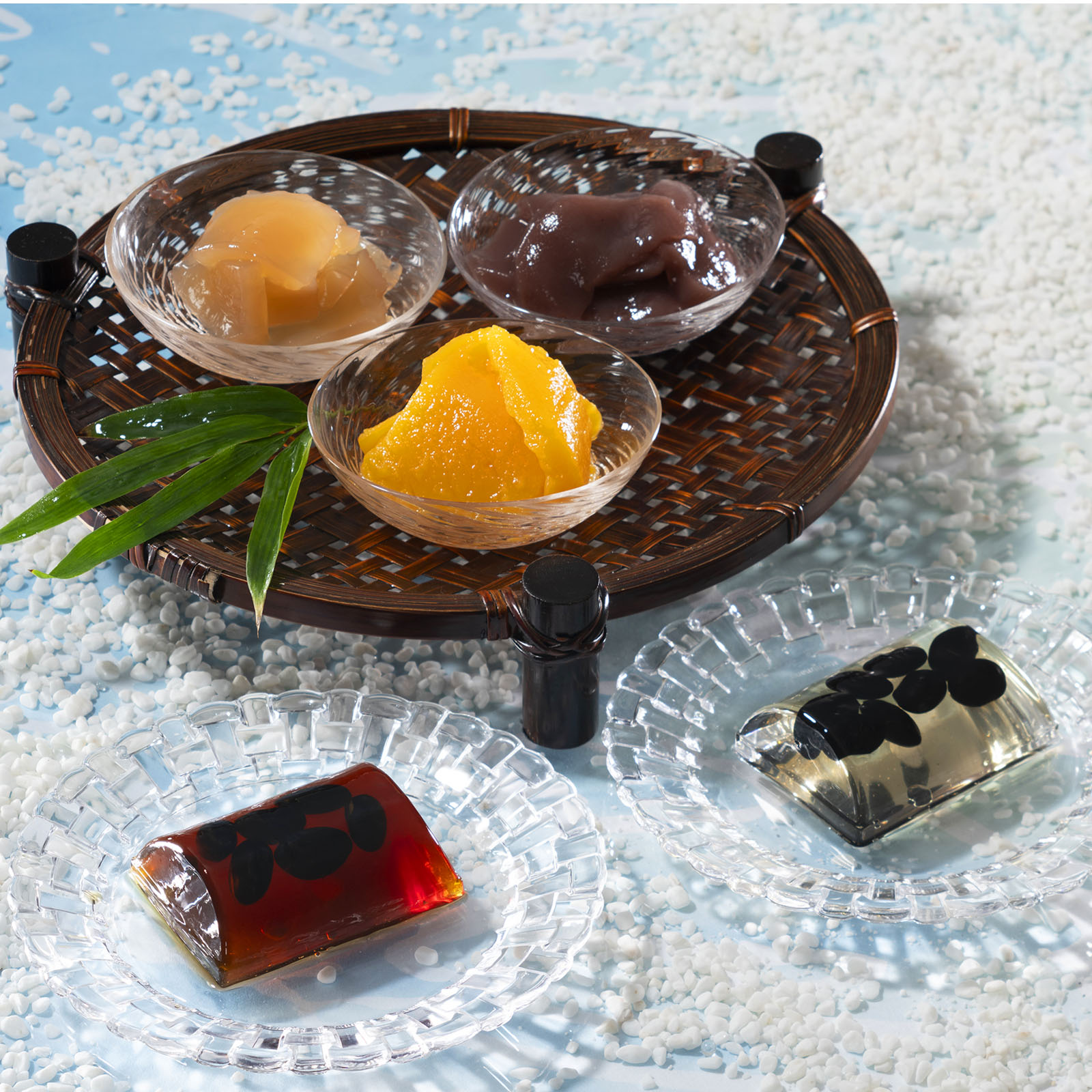 国内産丹波黒大豆を瑞々しくなめらかなゼリーで包んだ『寄石恋』、特殊製法により素材本来の味を引き出した生仕立て涼菓『いづみ流るゝ』、涼菓二種の詰め合わせ。ひと時の“涼”を感じていただければ幸いでございます。