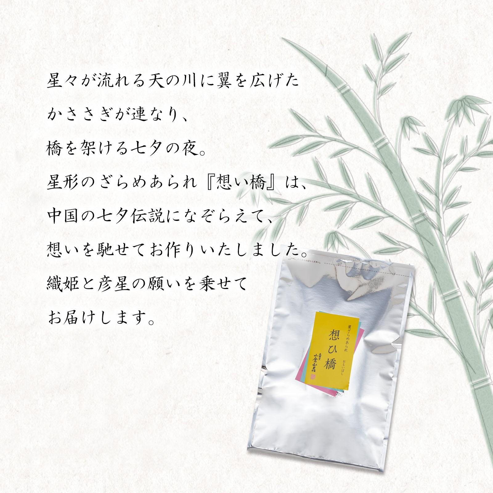 星形のざらめあられ『想ひ橋』は、中国の七夕伝説になぞらえて、想いを馳せてお作りいたしました。