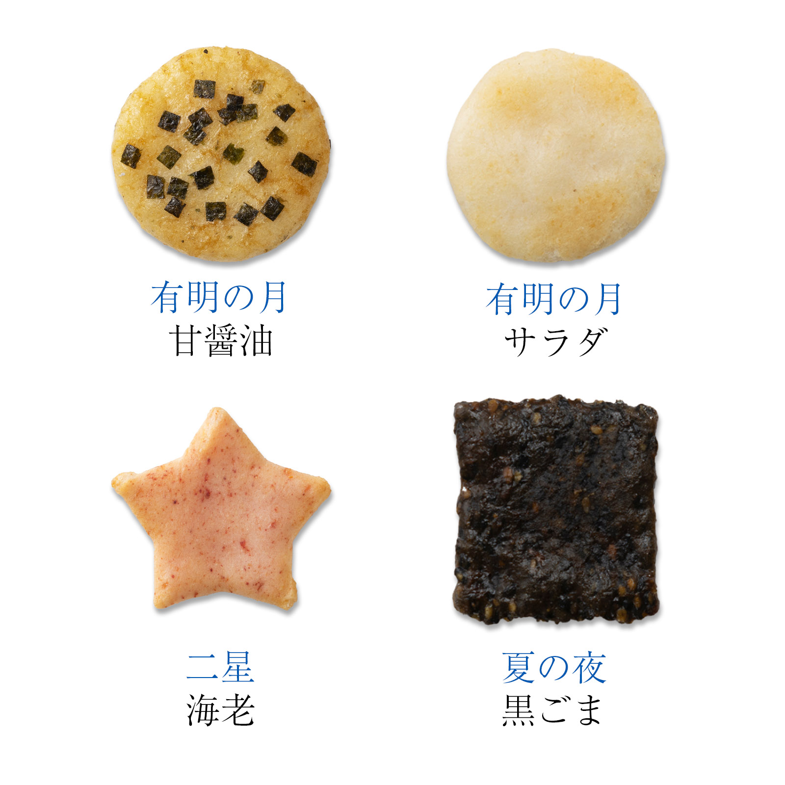 天の川を流れる星に見立てておつくりした星形あられ。風味豊かなえびを使用しました。 -