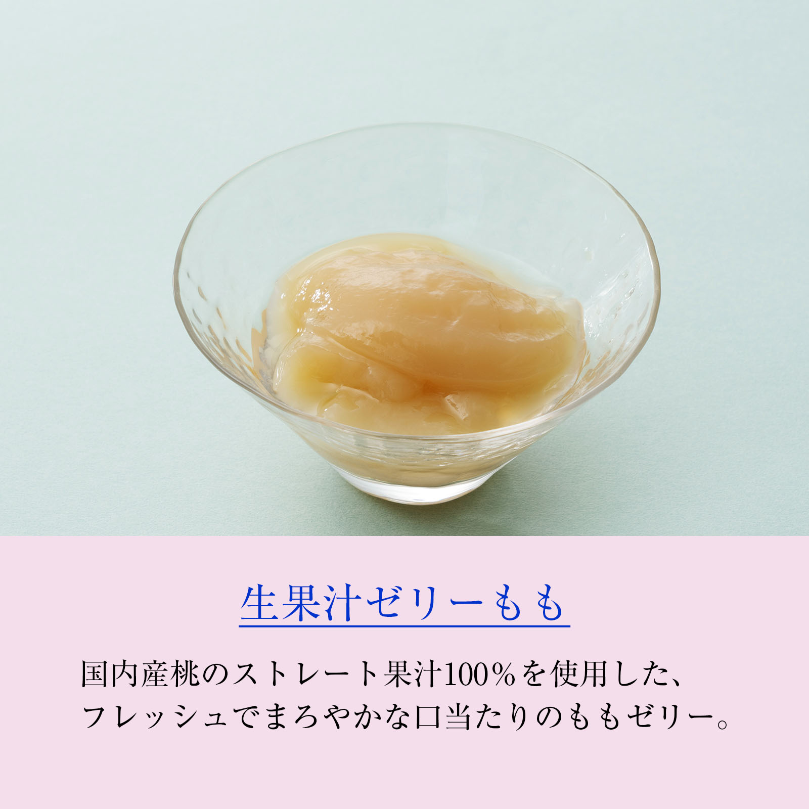 国内産桃のストレート果汁100%を 使用した、フレッシュでまろやかな口当たりのももゼリー。