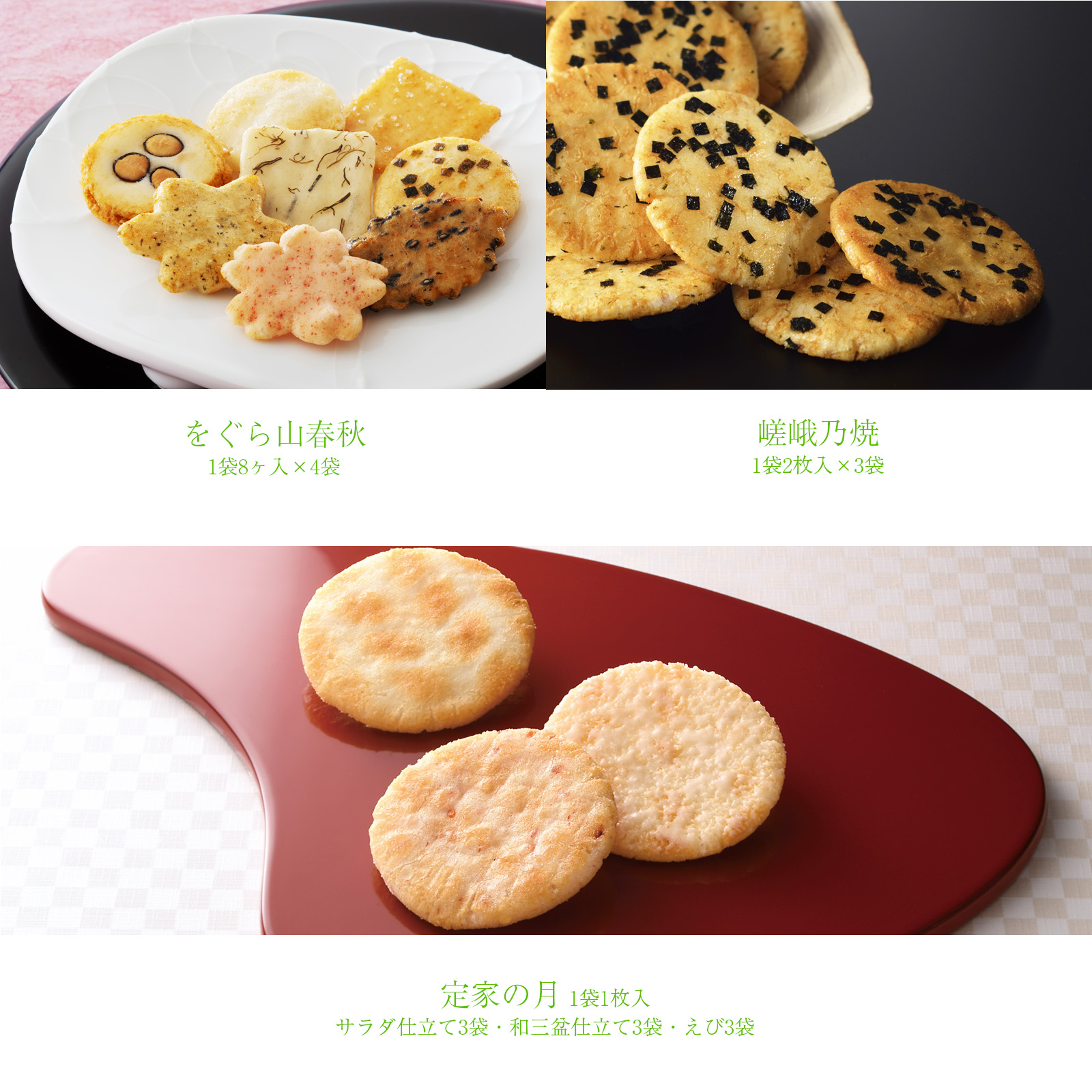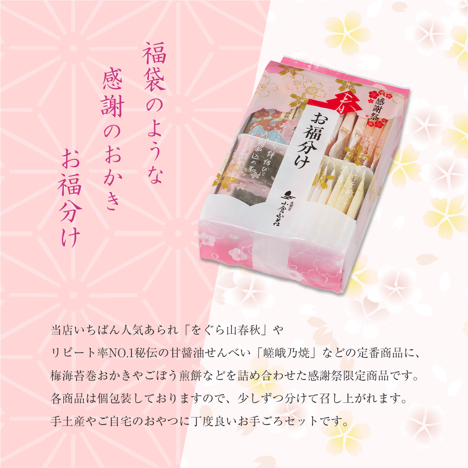 当店いちばん人気あられ「をぐら山春秋」やリピート率NO.1秘伝の甘醤油せんべい「嵯峨乃焼」などの定番商品に、梅海苔巻おかきやごぼうせんべい などを詰め合わせた感謝祭限定商品です。