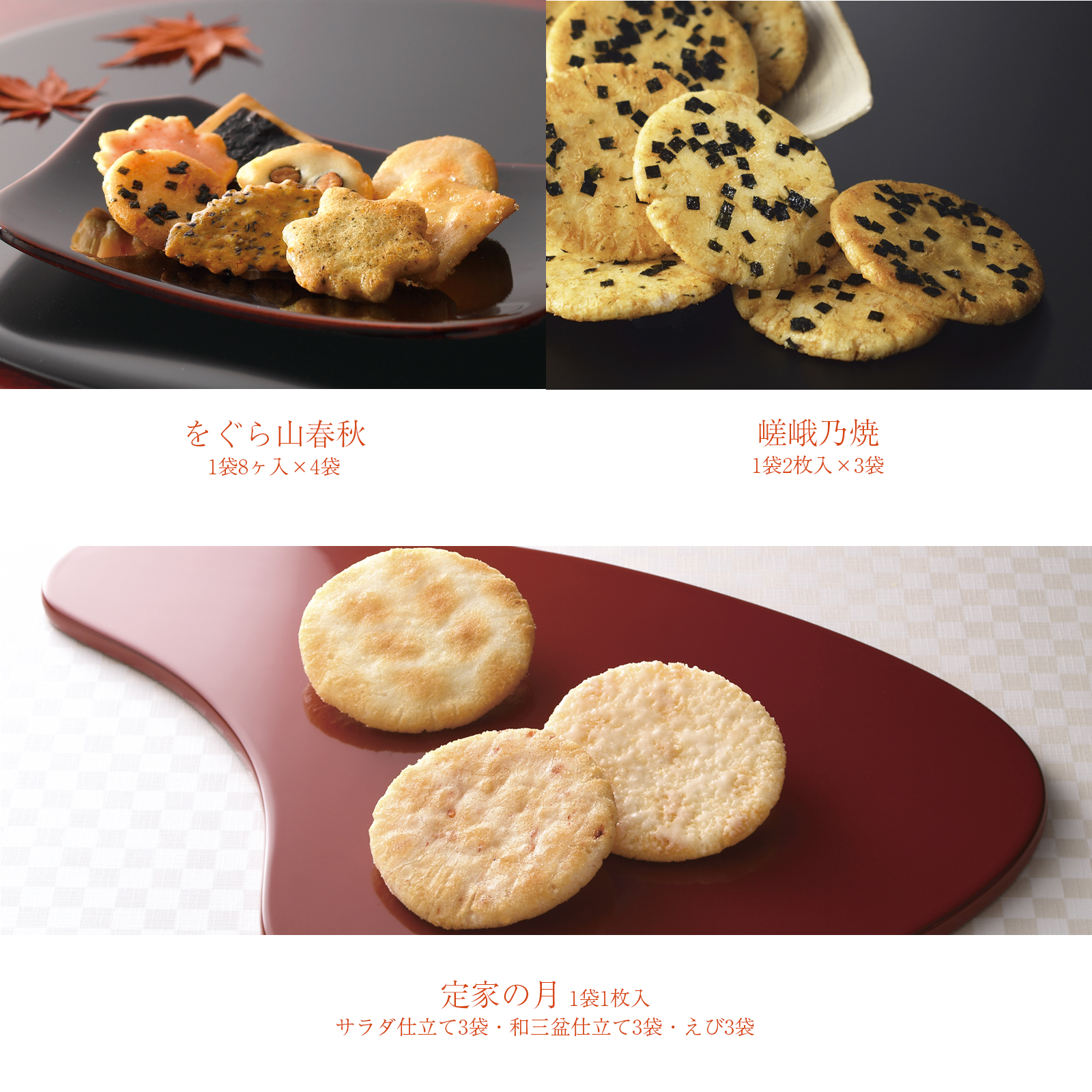 定家の月1袋1枚入 サラダ仕立て3袋・和三盆仕立て3袋・えび3袋 ふっくらと焼き上げた三趣のお味。