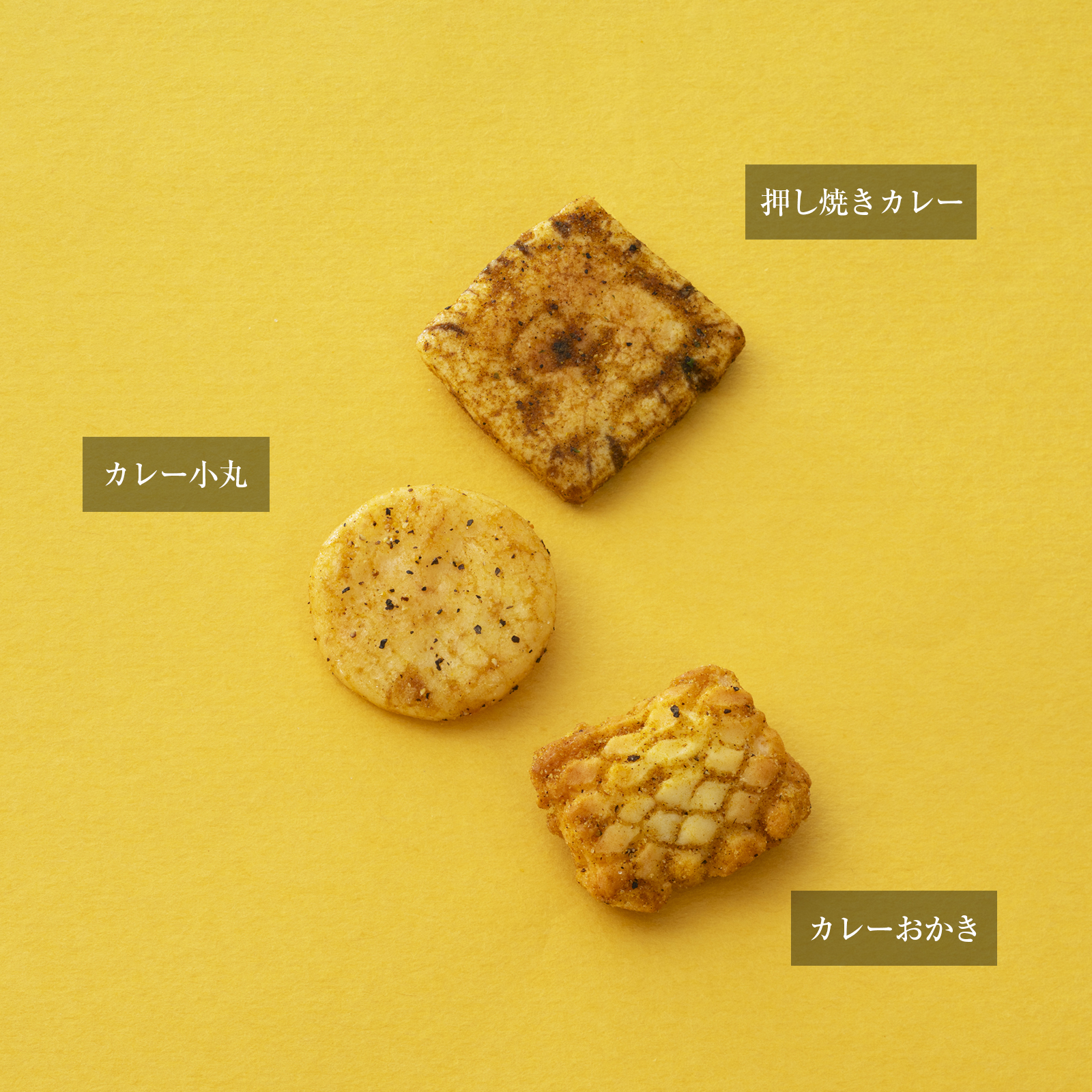 ころんとしたカレーおかきはスパイスを効かせた香り豊かなお味、丸いカレーは甘辛醤油をベースにした味わい深いお味、四角いカレーは隠し味にソースを使用したぴりりと辛口なお味。3つのカレーの味くらべ。