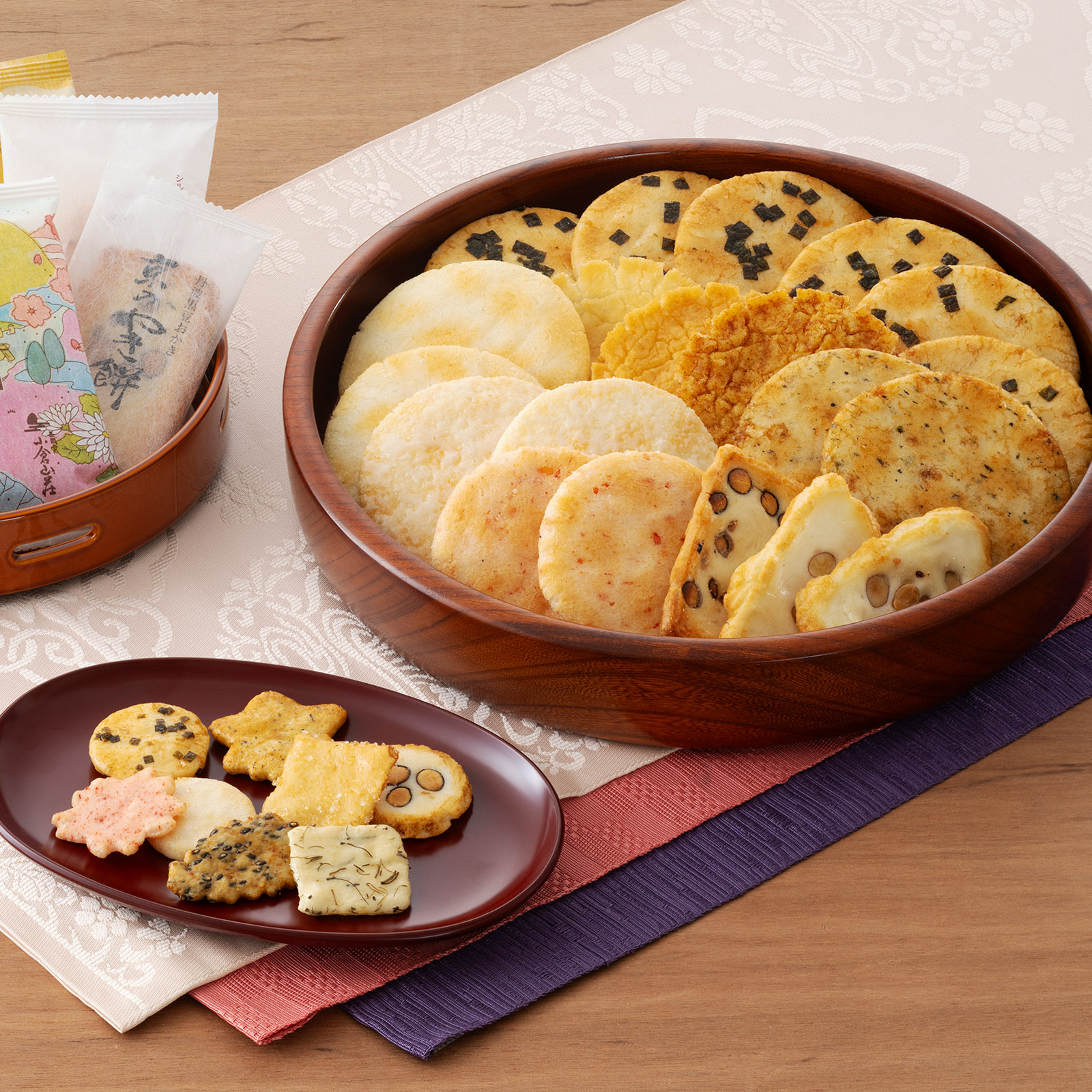 小倉山荘を代表する人気米菓「をぐら山春秋」や「嵯峨乃焼」に加え、ふっくらと焼き上げた三趣の「定家の月」、軽い口当たりの揚げせんべい「小倉名月」など、根強い人気を誇る米菓を取り揃えました。