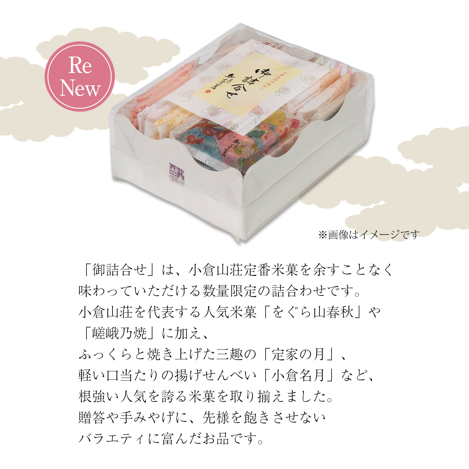 「御詰合せ」は、小倉山荘定番米菓を余すことなく味わっていただける数量限定の詰合わせです。