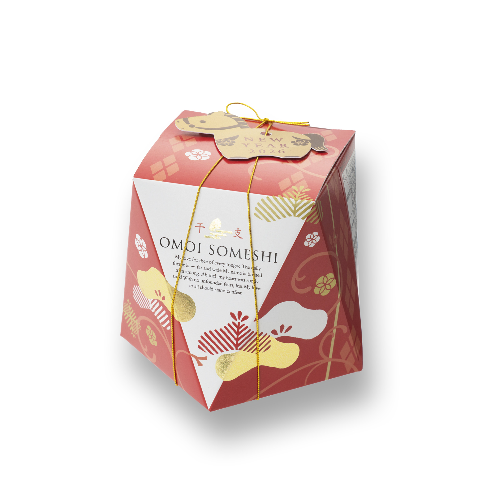 人気チョコあられ「想ひそめし」に干支をあしらった、迎春バージョン。