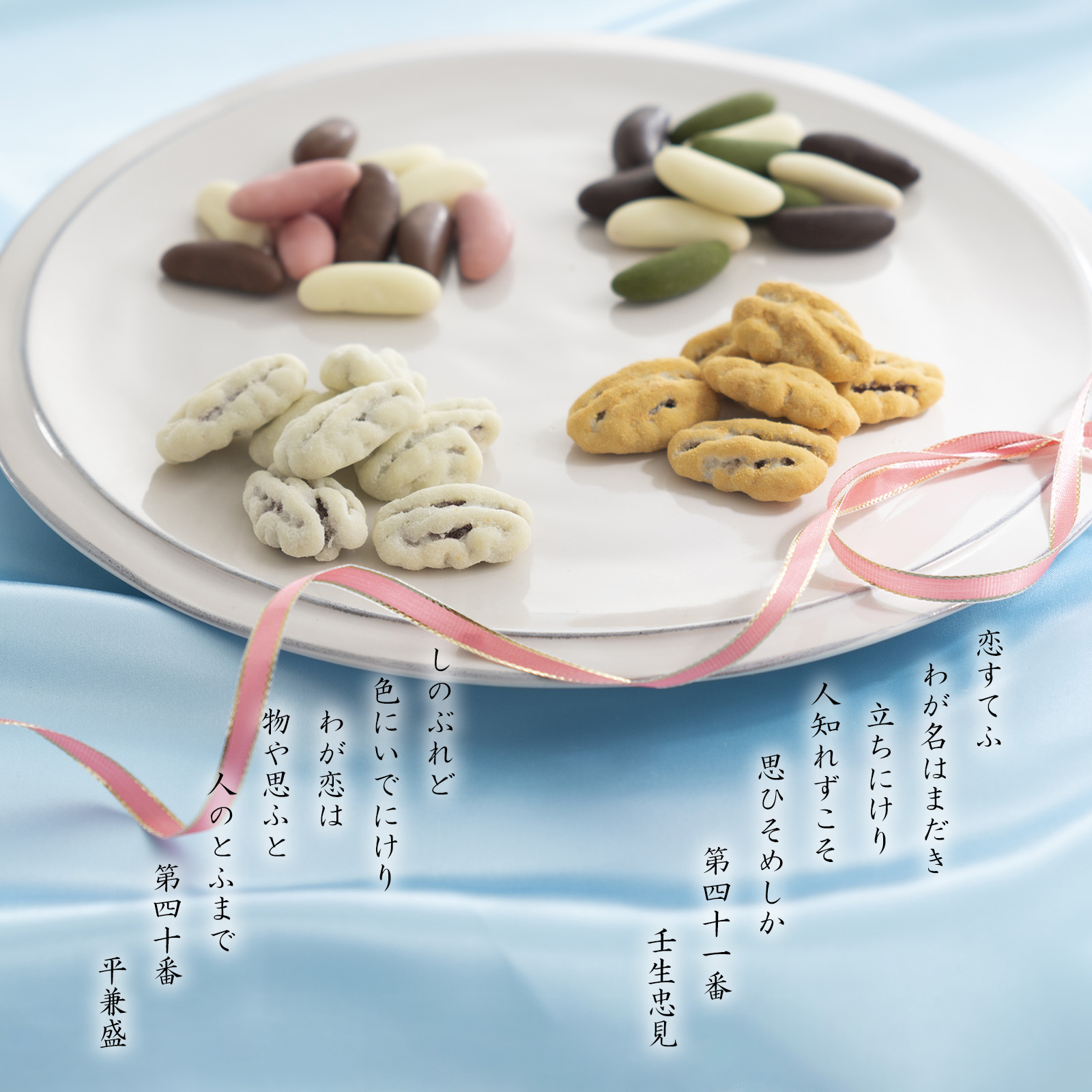平安時代、内裏歌合わせで結びを飾り競い合った壬生忠見と平兼盛の優劣つけがたい恋歌2種に思いを寄せた「想ひそめし」と「ペカンナッツショコラ」の詰め合わせです。