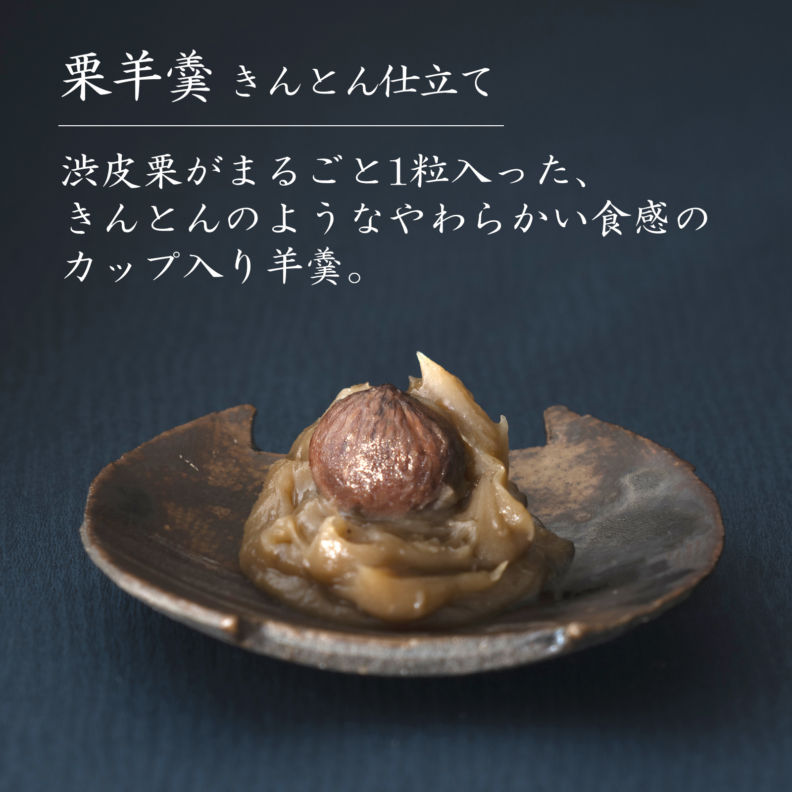 渋皮栗がまるごと1粒入った、きんとんのようなやわらかい食感のカップ入り羊羹。
