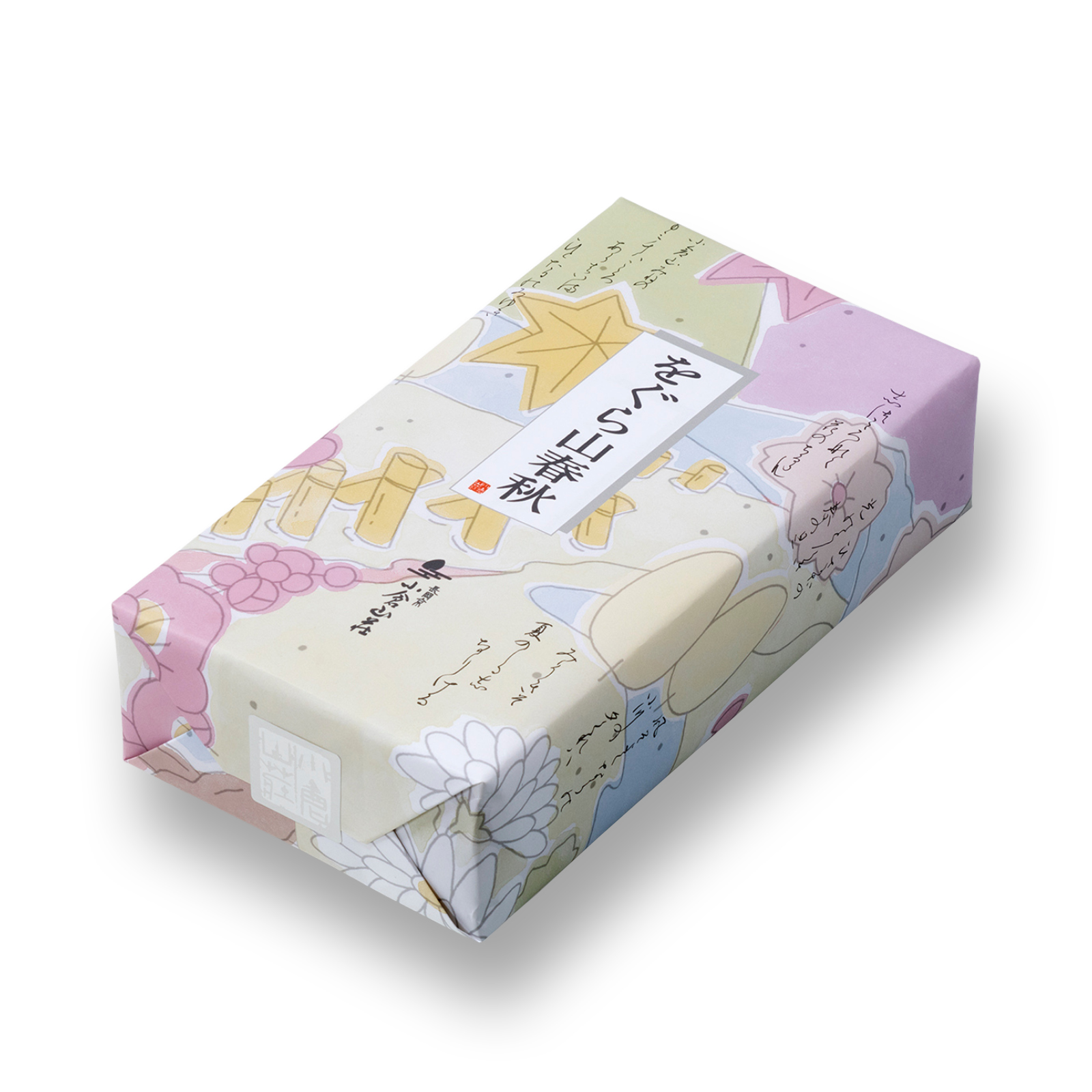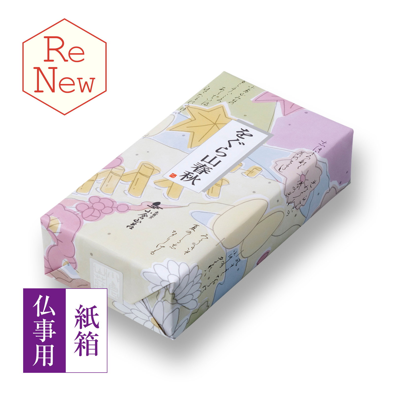 誰もが故人を偲んで掌を合わせるとき、その手向けの品として、また、来客への引き物として当店の品をお使いいただければ、と思い銘菓「をぐら山春秋」を仏事用包装でおつくりしました。包装紙と小袋をしっとりした色合いに仕上げています。