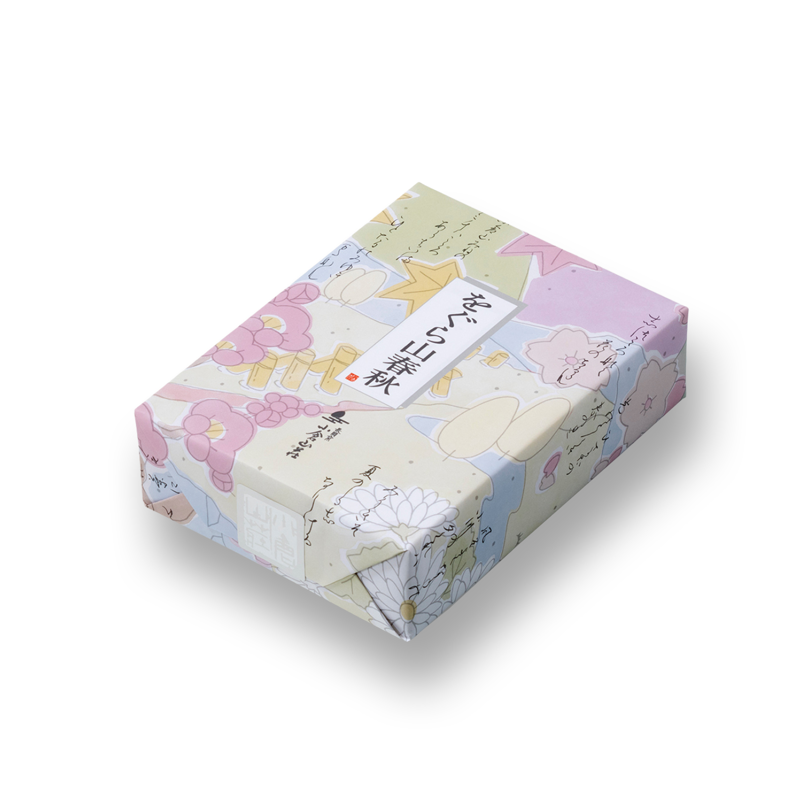 誰もが故人を偲んで掌を合わせるとき、その手向けの品として、また、来客への引き物として当店の品をお使いいただければ、と思い銘菓「をぐら山春秋」を仏事用包装でおつくりしました。包装紙と小袋をしっとりした色合いに仕上げています。