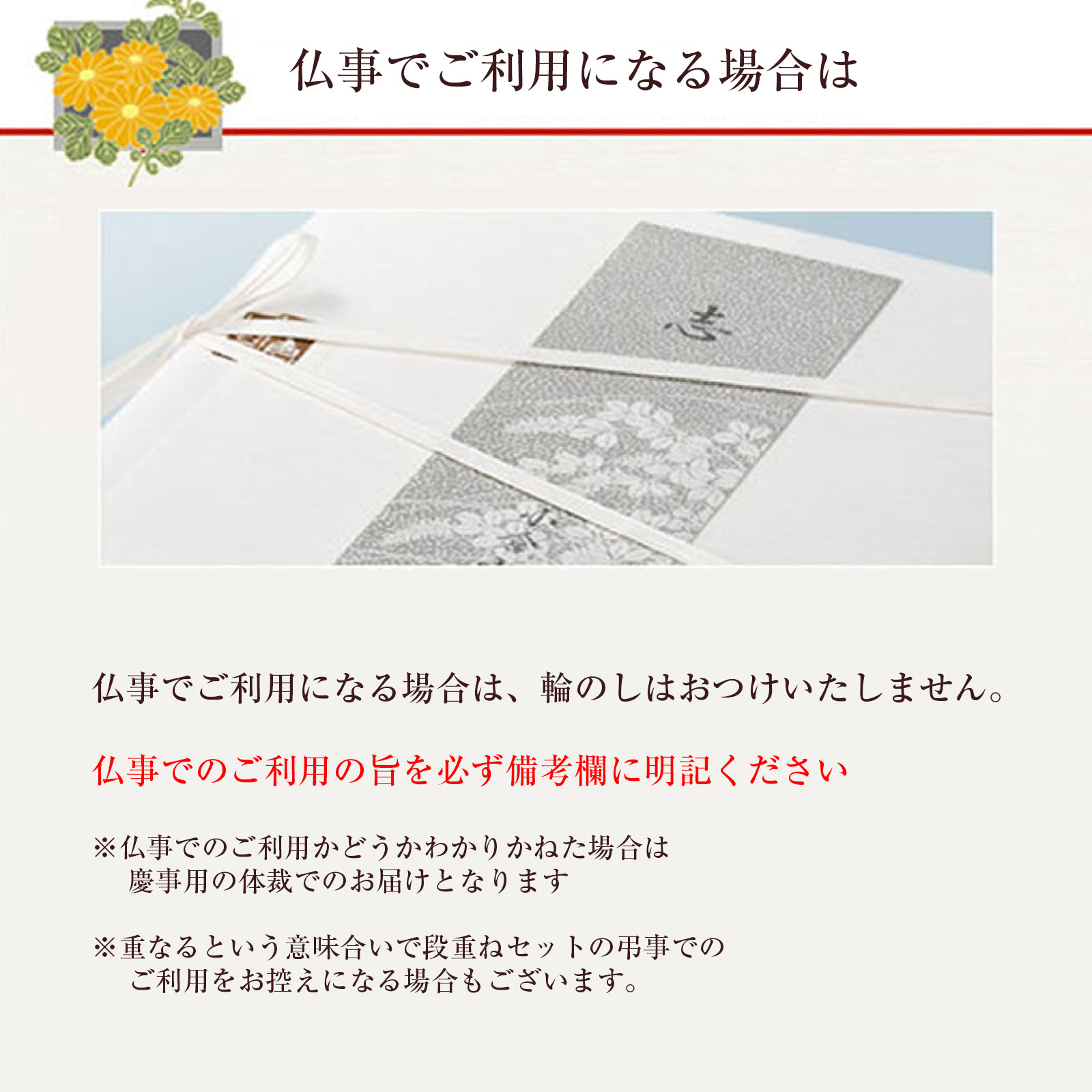 仏事にご利用になる場合は、輪のしはおつけいたしません。仏事にご利用になる場合は、輪のしはおつけいたしません。