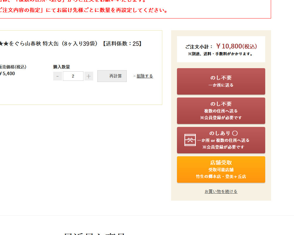 - お品をお買い物かごに入れた後、「店舗受取」ボタンを選択します。